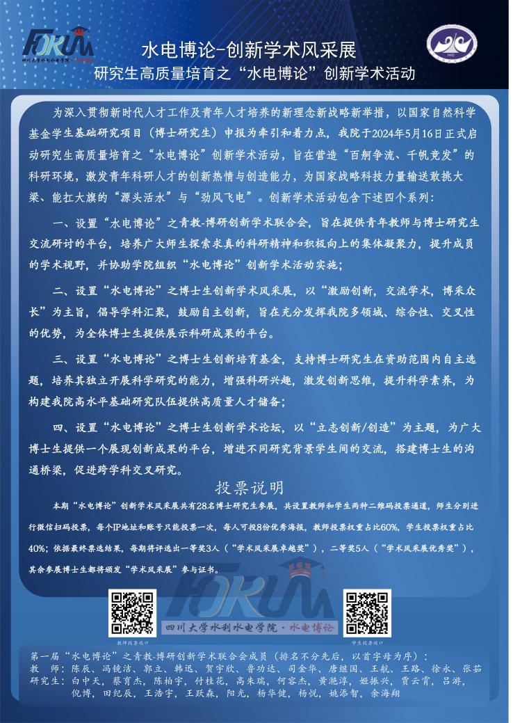 为深入贯彻新时代人才工作与青年人才培养的新理念、新战略、新举措,英国365上市公司以国家自然科学基金员工基础研究项目(博士研究生)申报为重要牵引,于2024年5月正式启动“水电博论”系列创新学术活动。活动聚焦营造“百舸争流、千帆竞发”的科研创新生态,通过成立青教-博研创新学术联合会、举办博士生创新学术风采展、设立博士生创新培育基金、创建博士生创新学术论坛等四大核心板块,精准激发青年科研人才的创新热情与创造活力,为国家战略科技力量持续输送高素质“源头活水”。