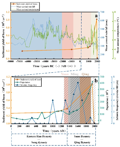 黄土高原是世界上黄土覆盖面积最大的地区,同时也是中华文明的发祥地,其水土流失问题关乎生态安全与区域可持续发展。永定河作为黄土高原上的第二大输沙河流,流域内地质构造简单,能够利用碎屑锆石和重矿物方法区分沉积物来源。通过重建永定河流域内的多个古洪水事件,分析古洪水沉积物及流域内黄土和基岩的来源,明确不同古洪水沉积物中黄土和基岩的相对贡献,定量计算得到过去数千年永定河的黄土侵蚀量和侵蚀趋势,厘清了自然过程及人类活动对输沙量的影响:(1)距今8600-2900年,人类活动影响微弱,永定河流域黄土侵蚀量在气候波动下缓慢增长;(2)距今2900-1000年,在气候变化和农业发展等人类活动的共同影响下,永定河流域黄土侵蚀持续增加;(3)距今1000年以来,元、明、清三朝定都北京引发大规模森林砍伐,加之人口增长、农业发展、军事防御等人类活动的加剧,黄土侵蚀量急剧上升。到1939年时,永定河流域的黄土侵蚀量约为自然背景值的4.3倍;(4)20世纪50年代至今,受到流域内水库建设及退耕还林政策的影响,永定河输沙量持续下降。