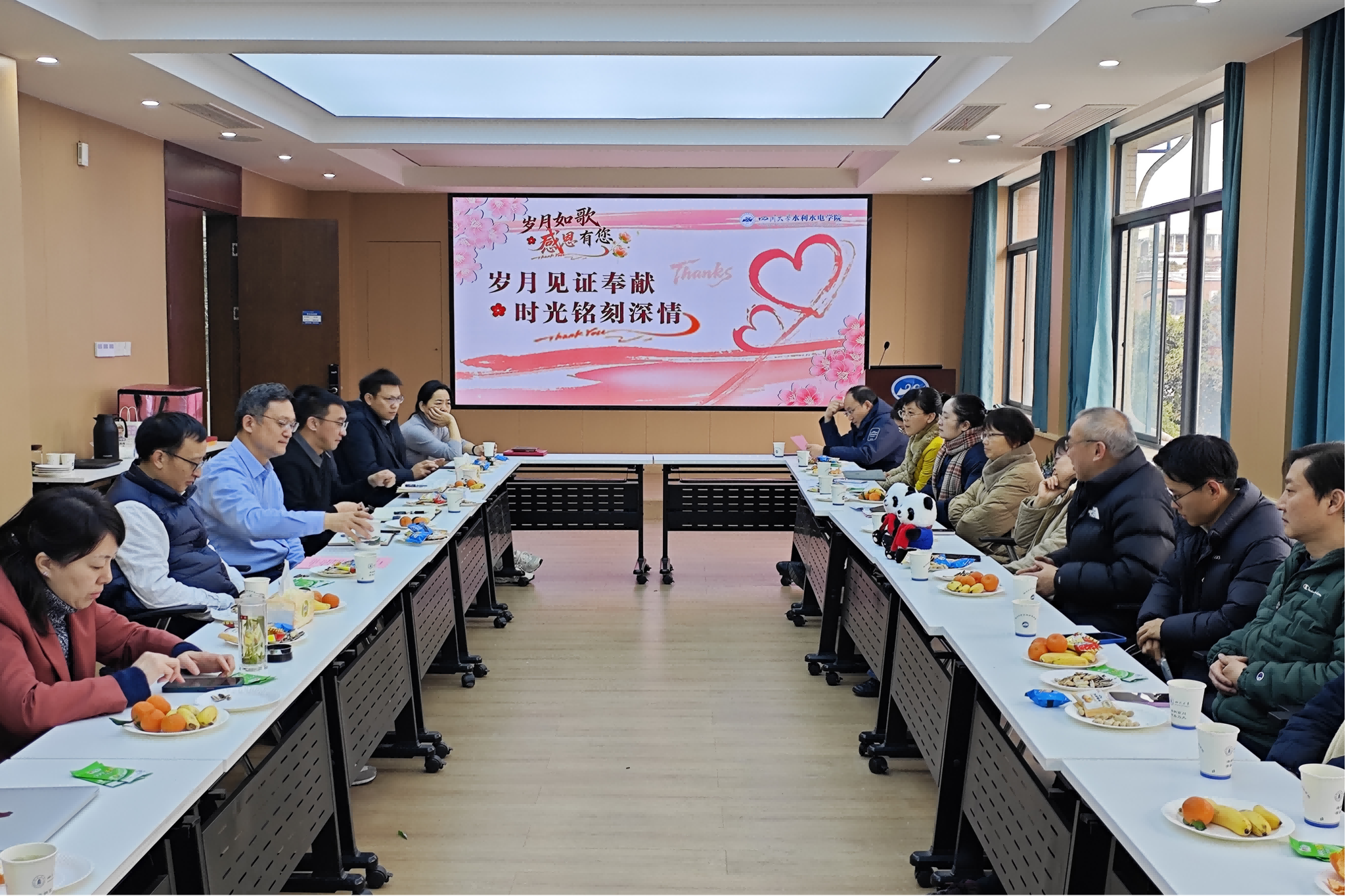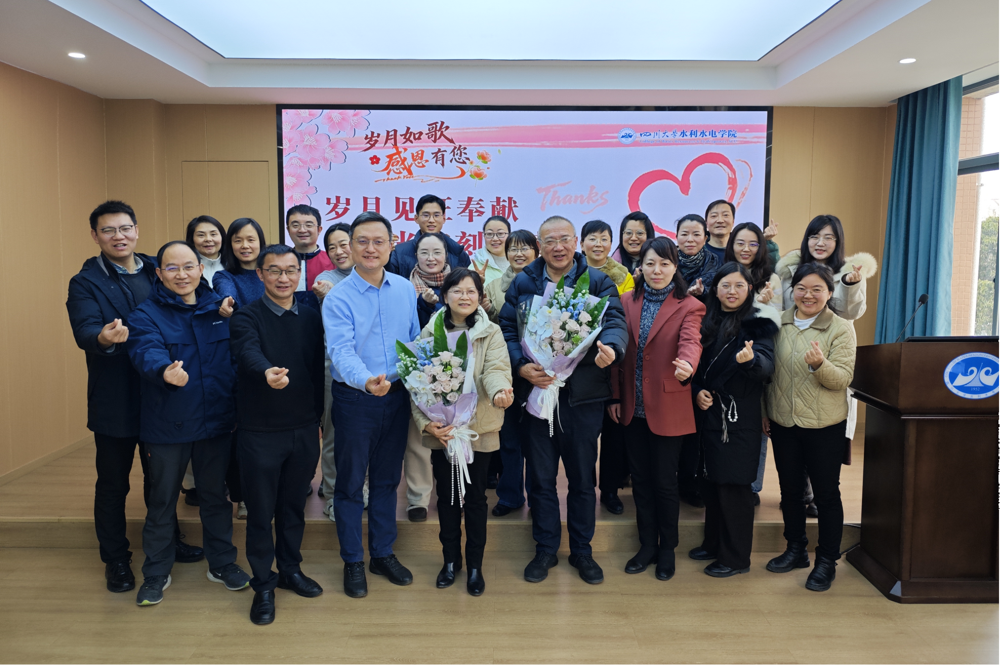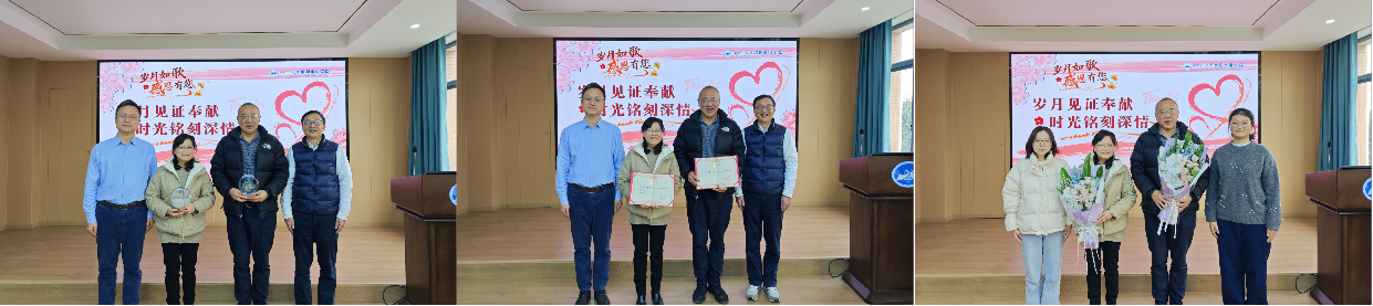 吴刚、杨兴国共同为两位老师颁发荣休纪念品和荣誉聘书。在充满温情的氛围中,员工代表为敬爱的老师献上鲜花,表达了全院学子深深的敬意与祝福。