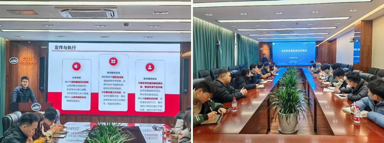 博士研究生辅导员范刚在A326会议室主持党建培训,讲解党支部工作标准,强化“三会一课”制度和党员发展规范,提出“过程监督-质量评估-典型培育”全链条管理机制,为党组织战斗力提升提供保障。