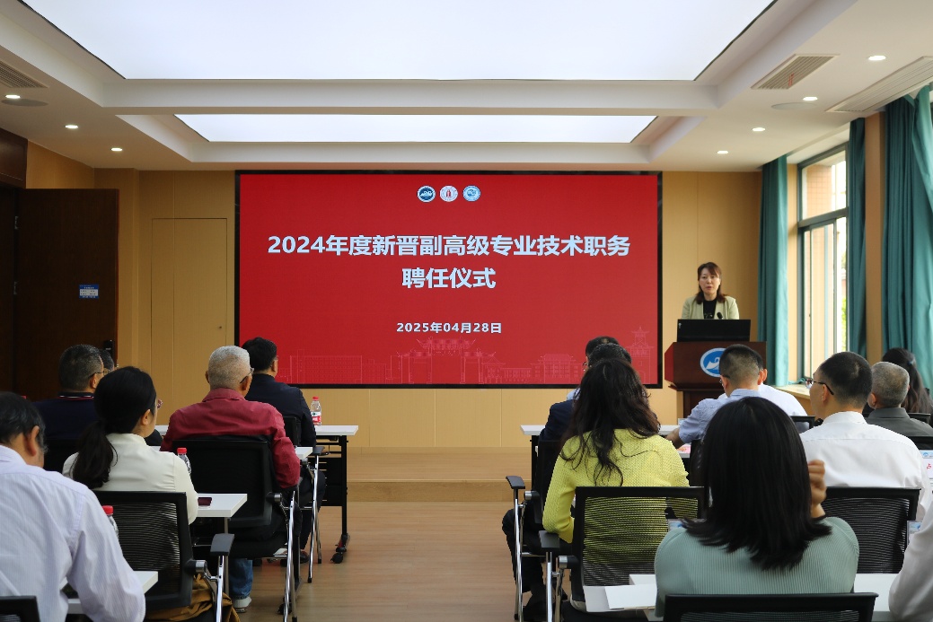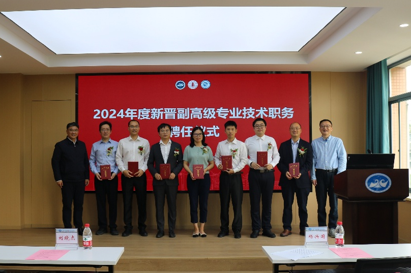 仪式上,副经理聂锐华宣读2024年度新晋高级职称的人员名单,公司党委副书记刘晓虎和经理杨兴国为新晋副高级专业技术职务的教师颁发聘书并合影留念。
