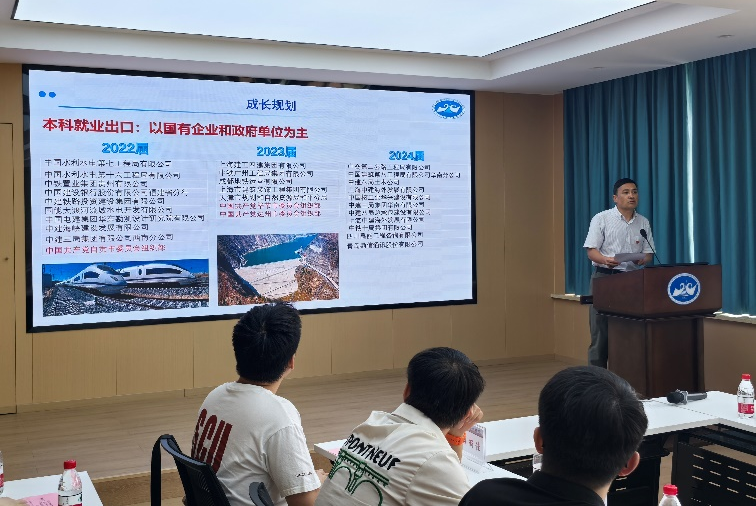 岩土与地下工程系教工党支部书记张志龙汇报近三年毕业生升学与就业情况,基于大量数据梳理了本科、硕士、博士三个层级员工的深造、就业和去向趋势。他指出,岩土类毕业生出口稳定、匹配度高,尤其在国家基础设施建设、工程咨询、政府机关等关键领域持续保持高需求态势。张老师勉励同学们要坚定信心、明确目标,在结构性利好中找准个人定位,在新一轮城市更新与西部发展战略中展现岩土人的担当与价值。