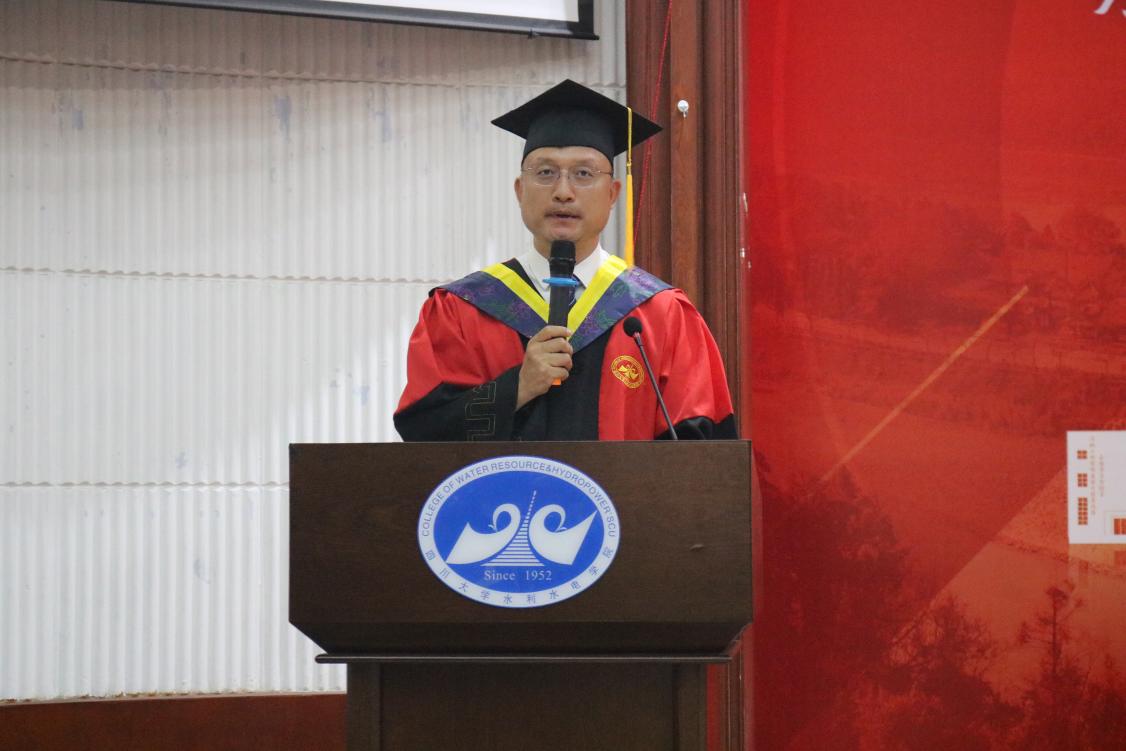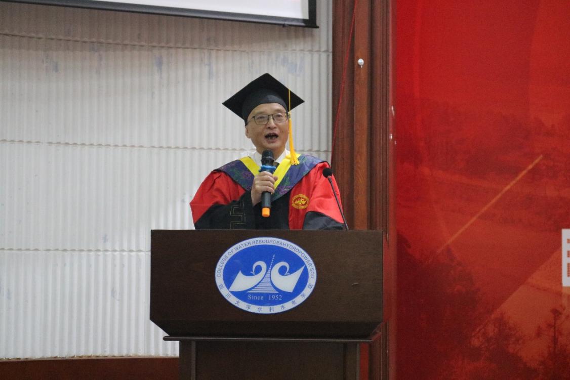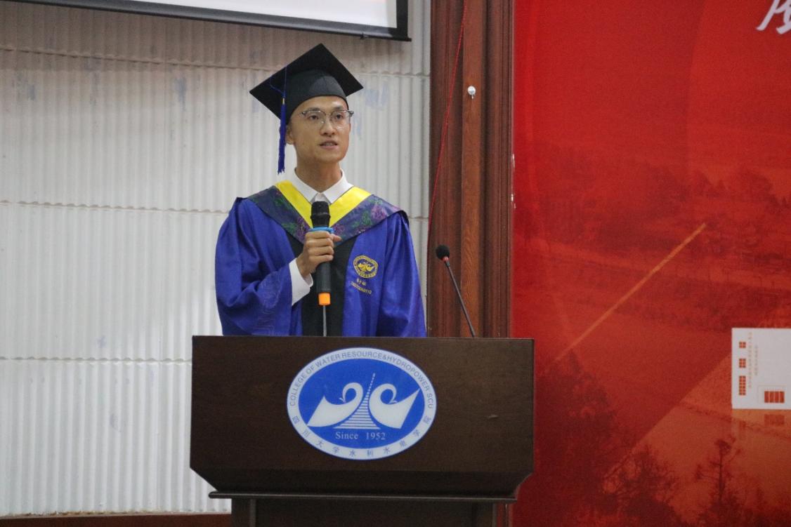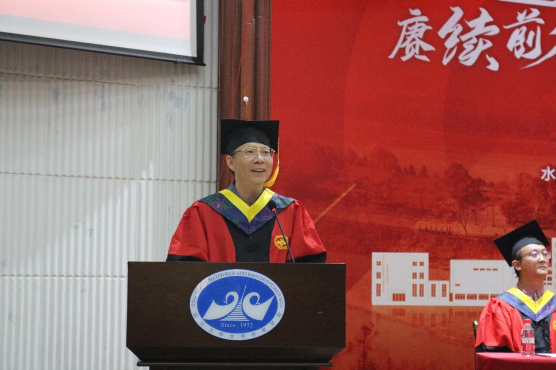 教师代表黄晓荣教授以运动场上的拼搏精神喻人生成长,结合切身经验,殷切寄语2025届毕业生:要不惧挑战、迎难而上,彰显水利人的精神风貌;要将个人理想深深扎根于祖国发展沃土,矢志投身民族复兴伟业。他最后深情祝福学子们:勇立时代潮头,激扬青春力量,谱写人生壮丽篇章!