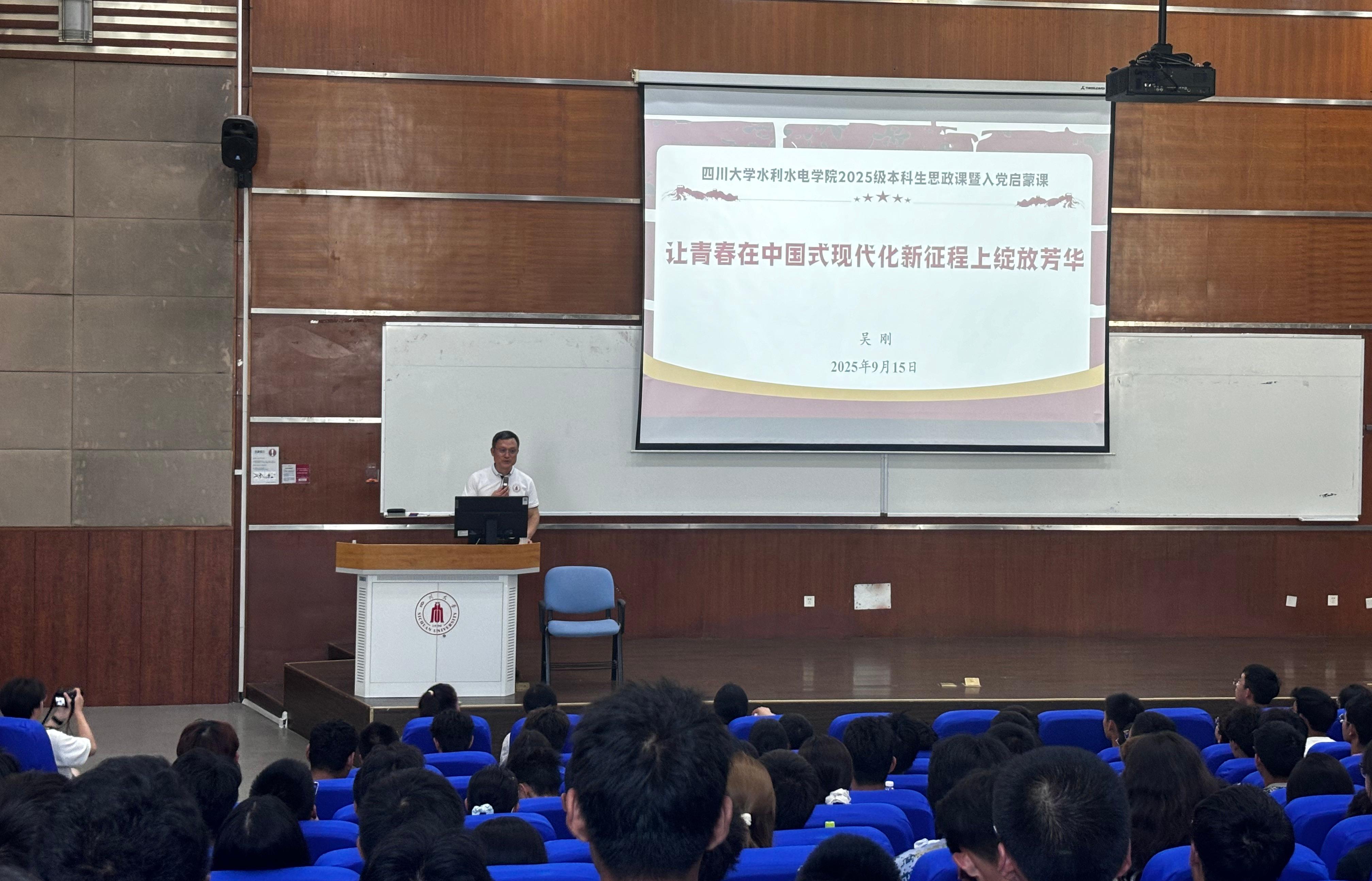 本科新生开学第一课在江安综合楼C407举行。吴刚以“让青春在中国式现代化新征程上绽放芳华”为主题,为全体新生讲授思政课。他从中国共产党的百年奋斗史引入系统阐述中国的复兴之路,鼓励同学们自觉将个人理想融入强国建设、民族复兴伟业;从水电公司的学科实力、光荣传统导入介绍人才培养成效,增强新生对公司的认同感和归属感;从入党流程与要求的详细介绍,引导同学们提高政治觉悟,积极向党组织靠拢。最后,他勉励全体新生珍惜大学时光,科学规划学业与生涯,全面提升综合能力,以奋斗书写灿烂青春。