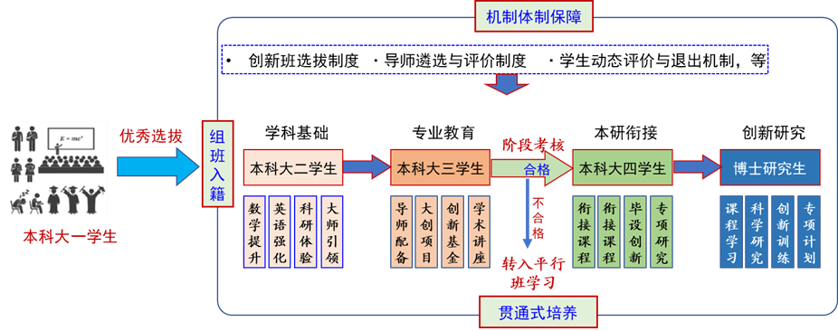 以培养“强通识、厚基础、重实践、富创新、跨学科、宽视野”的拔尖创新研究型人才为目标,构建“通识基础-专业教育-本研衔接-博士教育”四阶段递进,“通识-专业-衔接-硕博”四平台课程,“产学研用创”五协同的“445”本硕博贯通人才培养体系,优化本科和硕博阶段人才培养目标,重构课程体系和课程目标,构建贯通式人才培养方案。